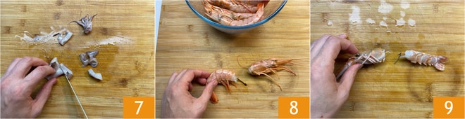 Entfernt die Augen und schneidet den Mantel in Ringe 7, dann schneidet die Tentakel in Stücke. Fahrt mit den Garnelen fort: Entfernt den Kopf 8, den Panzer 9 und den Darm.