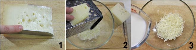 Um die Gnocchi mit Asiago-Creme zuzubereiten, beginnen Sie mit der Creme: Nehmen Sie den Asiago und entfernen Sie die Rinde 1, reiben Sie ihn 2 und lassen Sie ihn 20 Minuten in der Milch einweichen 3.