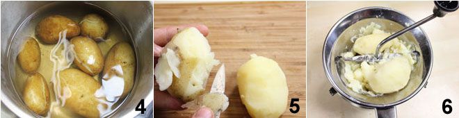 In der Zwischenzeit bereiten Sie die Gnocchi vor. Waschen Sie die Kartoffeln und kochen Sie sie mit der Schale in einem Topf mit Salzwasser 4, wenn sie gekocht sind, lassen Sie sie abtropfen und schälen Sie sie noch warm 5. Zerdrücken Sie sie mit Hilfe einer Kartoffelpresse oder einem Kartoffelstampfer und geben Sie sie in eine große Schüssel 6,