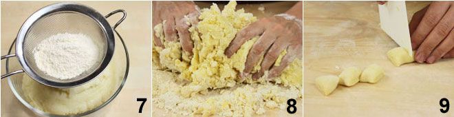 fügen Sie dann das gesiebte Mehl und eine Prise Salz hinzu 7. Übertragen Sie den Teig auf eine Arbeitsfläche, um ihn leichter zu bearbeiten, und kneten Sie ihn, bis eine homogene Masse entsteht (falls nötig, fügen Sie mehr Mehl hinzu, um die Bearbeitung zu erleichtern) 8. Lassen Sie den Teig dann 10 Minuten bei Raumtemperatur ruhen. Nach der benötigten Zeit teilen Sie ihn in viele Stränge und schneiden Sie Stücke von 2-3 Zentimetern Breite 9,