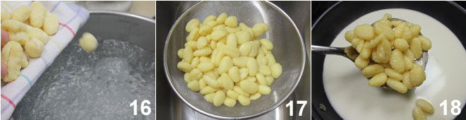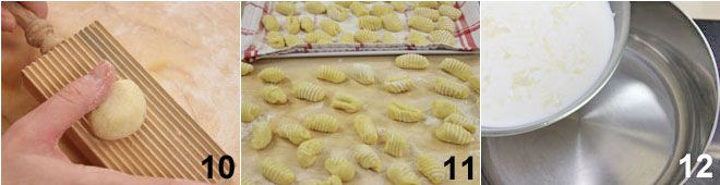 beginnen Sie dann, Ihre Gnocchi mit Hilfe des speziellen Gnocchibretts zu formen 10, legen Sie sie schließlich auf eine bemehlte Oberfläche oder ein Tablett, bevor Sie sie kochen 11. Nehmen Sie nun den Asiago mit der Milch und geben Sie ihn in einen kleinen Topf, bringen Sie ihn dann zum Kochen 12.