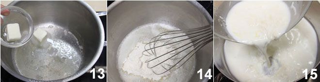 In der Zwischenzeit nehmen Sie einen kleinen Topf, schmelzen Sie die Butter 13 und fügen Sie das Mehl mit Hilfe eines Schneebesens hinzu 14. Wenn die Asiago-Milch-Mischung den Siedepunkt erreicht hat, fügen Sie sie der Butter hinzu und rühren Sie weiter mit dem Schneebesen, um alle Zutaten zu vermischen 15. Sobald die Creme eindickt oder wieder zum Kochen kommt, nehmen Sie sie vom Herd. Probieren Sie sie und passen Sie sie bei Bedarf mit Salz an.