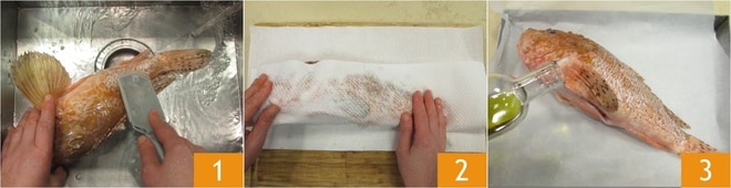 Um die Gnocchi mit Seeteufel-Ragout und Bottarga zuzubereiten, bereiten Sie zuerst den Fisch vor: Entfernen Sie die Schuppen unter kaltem fließendem Wasser mit dem entsprechenden Werkzeug oder einem Messer 1, dann trocknen Sie ihn gut ab 2 und entfernen Sie die Innereien. Legen Sie den ganzen Seeteufel auf ein mit Backpapier ausgelegtes Backblech und würzen Sie mit Olivenöl 3.