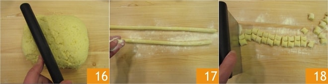 Teilen Sie den Teig in kleinere Portionen 16, formen Sie Stangen 17 und schneiden Sie sie mit einem Teigschaber in ca. 2 cm große Stücke 18. Übertragen Sie die Gnocchi auf ein bemehltes Tuch und legen Sie sie zur Seite.