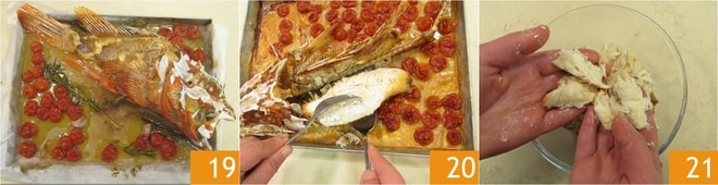 Nach der Garzeit des Seeteufels 19 nehmen Sie ihn aus dem Ofen und reinigen den Fisch, indem Sie nur das Fleisch herausnehmen 20. Übertragen Sie es in eine Schüssel und zerkleinern Sie es mit den Händen, überprüfen Sie, dass keine Gräten vorhanden sind 21.