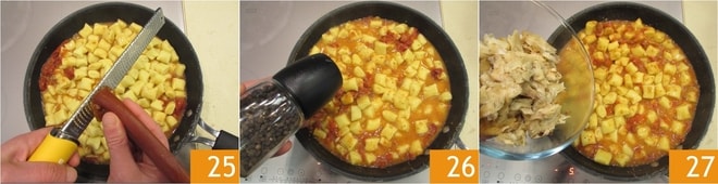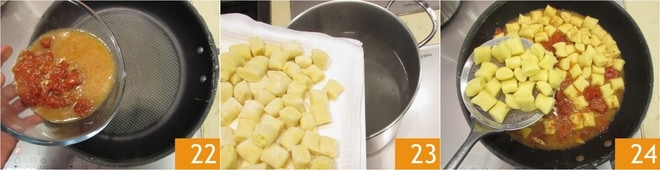 Geben Sie die Tomaten zusammen mit dem Kochwasser des Seeteufels in eine große Pfanne 22. In der Zwischenzeit bringen Sie einen Topf mit gesalzenem Wasser zum Kochen und kochen Sie die Gnocchi für einige Minuten 23. Wenn sie an die Oberfläche kommen, schöpfen Sie sie direkt in die Pfanne 24.