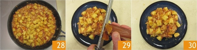 Fügen Sie eine großzügige Menge geriebener Bottarga hinzu 25 und braten Sie alles bei hoher Hitze an, um die Sauce zu reduzieren. Pfeffern Sie 26 und geben Sie das Seeteufelfleisch bei ausgeschalteter Hitze hinzu 27.