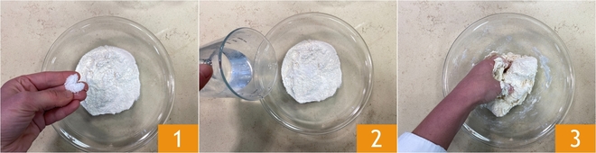 Um die Gnocchi mit Walnusscreme zuzubereiten, beginnen Sie mit dem frischen Teig. Mischen Sie das Mehl mit einer Prise Salz in einer Schüssel 1. Gießen Sie langsam das Wasser über das Mehl 2 und rühren Sie zuerst mit einem Holzlöffel, dann mit den Händen 3.