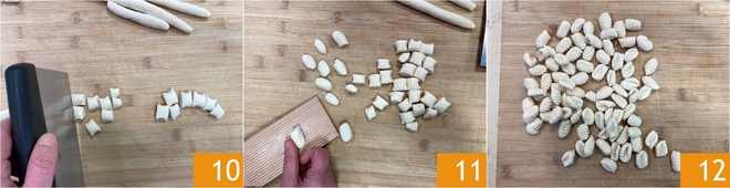 Schneiden Sie diese dann in Stücke von 2 cm 10. Nun können Sie sie mit einer Gabel oder einem Gnocchibrett 11 rollen, um die klassische Gnocchi-Form zu erhalten 12.