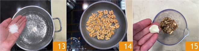 Bringen Sie einen Topf mit Salzwasser zum Kochen 13. In der Zwischenzeit bereiten Sie das Walnusspesto zu. Rösten Sie die Walnüsse in einer Pfanne bei niedriger Hitze für einige Minuten 14 und lassen Sie sie abkühlen. Geben Sie sie in ein hohes, schmales Gefäß zusammen mit dem Knoblauch 15.
