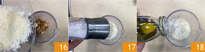 Fügen Sie auch den geriebenen Parmesankäse 16, das Salz 17, den Pfeffer und das Öl 18 hinzu.