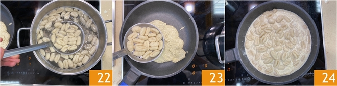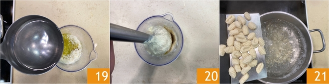 Fügen Sie eine kleine Kelle heißes Wasser hinzu 19 und pürieren Sie alles mit einem Stabmixer zu einer glatten und homogenen Creme 20. Sobald das Wasser kocht, kochen Sie die Gnocchi 21.