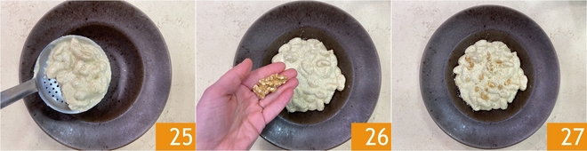 Anrichten Sie die Gnocchi 25, indem Sie sie mit einer Prise Parmesan und einigen zerbröselten Walnüssen 26 vervollständigen. Servieren Sie sie heiß 27.