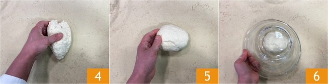 Übertragen Sie dann den Teig auf eine Arbeitsfläche 4 und kneten Sie ihn, bis er eine glatte und homogene Konsistenz hat 5; falls er zu klebrig ist, fügen Sie etwas Mehl hinzu. Decken Sie ihn mit einer Schüssel ab 6 und lassen Sie ihn 5 Minuten ruhen.