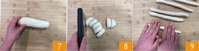 Nehmen Sie nun den Teig 7 und teilen Sie ihn in Stücke 8. Formen Sie Zylinder mit einem Durchmesser von etwa 1-2 cm 9.