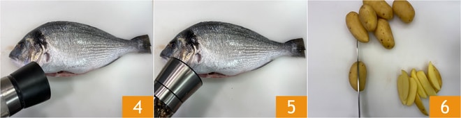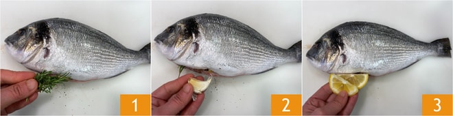 Um die Goldbrasse in der Mikrowelle zuzubereiten, beginnen Sie zuerst mit der Wie man die Goldbrasse putzt. Schneiden Sie mit einer Schere die Flossen ab und schuppen Sie den Fisch unter fließendem Wasser, indem Sie die Messerrückseite oder das entsprechende Werkzeug verwenden. Machen Sie einen Schnitt am Bauch des Fisches bis unter den Kopf. Entfernen Sie die Eingeweide und spülen Sie alles gründlich unter Wasser ab, um alle Verunreinigungen zu entfernen. Füllen Sie die Bauchhöhle mit Thymian, Rosmarin 1, Knoblauch 2 und Zitrone 3.