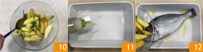 Mischen Sie alles 10. Gießen Sie einen Schuss Öl in eine Form 11, legen Sie die Goldbrasse darauf und fügen Sie die Kartoffeln hinzu 12.