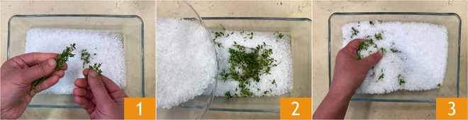 Um die Goldbrasse in Salzkruste zuzubereiten, geben Sie zuerst das erste Kilo Salz in eine Auflaufform, fügen Sie den Zitronenthymian hinzu 1, dann geben Sie den Rest des Salzes hinzu 2 und mischen Sie 3.