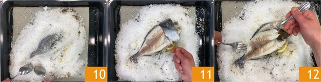 Wenn der Fisch gar ist, brechen Sie die Salzkruste mit 2 Löffeln 10, entfernen Sie vorsichtig die Haut 11 und entnehmen Sie die Filets 12. Mit zwei Gabeln ist es einfach, die Filets über dem Rückgrat zu heben; heben Sie dann den Kopf an, um das Rückgrat zu entfernen und auch die unteren Filets zu entnehmen.