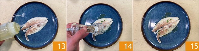Richten Sie an, würzen Sie mit Öl 13, Thymian und Pfeffer 14. Die Goldbrasse in Salzkruste ist bereit, genossen zu werden 15.