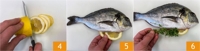 Schneiden Sie inzwischen die Zitrone in Scheiben 4 und füllen Sie den Bauch der zuvor gereinigten und ausgenommenen Goldbrasse mit den Zitronenscheiben 5 und dem Zitronenthymian 6.