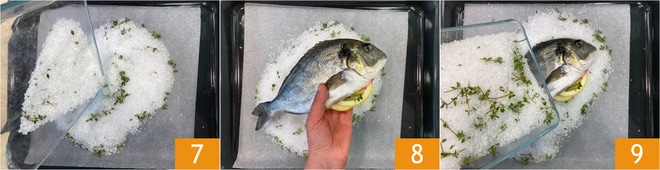 Gießen Sie auf das mit Backpapier ausgelegte Blech weniger als die Hälfte des aromatisierten Salzes 7, legen Sie die Goldbrasse darauf 8 und bedecken Sie sie mit dem restlichen Salz, sodass es gut am Fisch haftet 9. Backen Sie im vorgeheizten statischen Ofen bei 200°C für 25-30 Minuten.
