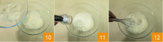 und den geriebenen Parmesan, wobei Sie 10-20 g von der Gesamtmenge zurückhalten 10. Fügen Sie den Pfeffer hinzu 11 und mischen Sie alles mit einem Schneebesen 12.