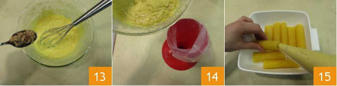 Fügen Sie dann auch etwas von dem pürierten Guanciale zur Creme hinzu 13, mischen Sie erneut und füllen Sie alles in einen Spritzbeutel 14. Verwenden Sie die Füllung, um Ihre Cannelloni zu füllen, und legen Sie sie nach und nach in eine zuvor gebutterte 20x20 cm große Auflaufform 15.