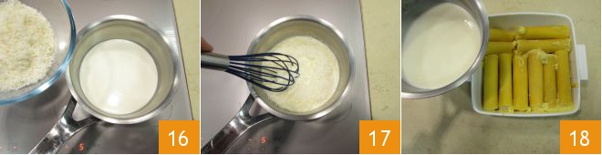 Kümmern Sie sich dann um die Sauce, erhitzen Sie die Sahne in einem kleinen Topf, fügen Sie dann 60 g Parmesan hinzu 16 und mischen Sie mit einem Schneebesen 17, bis er vollständig aufgelöst ist. Gießen Sie dann über die Cannelloni 18