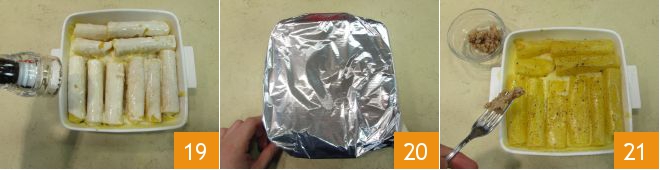 und fügen Sie noch etwas schwarzen Pfeffer hinzu 19. Decken Sie mit einem Blatt Aluminiumfolie ab und backen Sie in einem vorgeheizten statischen Ofen bei 180° für 25 Minuten. Nach dieser Zeit nehmen Sie die Auflaufform aus dem Ofen, entfernen die Aluminiumfolie und legen den restlichen Guanciale darauf 21