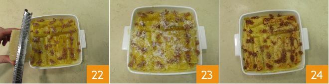 und den am Anfang beiseitegelegten Parmesan (22-23). Backen Sie im Grillmodus bei 250° für weitere 3 Minuten. Wenn der Guanciale knusprig ist, aus dem Ofen nehmen und Ihre Cannelloni servieren 24.