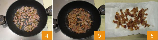 Um die goldgelben Cannelloni zuzubereiten, reinigen Sie zuerst den Guanciale, indem Sie die Schwarte auf der Unterseite entfernen 1. Schneiden Sie ihn dann in Würfel oder Streifen 2. Erhitzen Sie einen Topf auf dem Herd und geben Sie den Guanciale hinein 5.