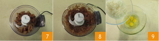 Zu diesem Zeitpunkt geben Sie den Guanciale in einen Mixer 7 und pürieren alles 8. In einer separaten Schüssel schlagen Sie die 6 Eier auf, fügen den geriebenen Pecorino hinzu 9