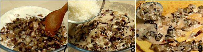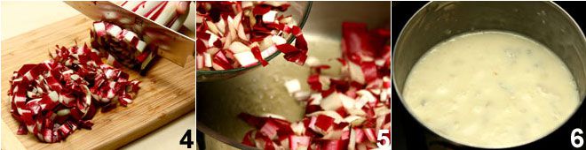 Fahren Sie dann mit der Zubereitung der Füllung fort, indem Sie den Trevisaner Radicchio in Streifen schneiden 4, nachdem Sie ihn sorgfältig gewaschen haben. Schmelzen Sie 40 g Butter in einem Topf, fügen Sie den Radicchio hinzu 5, salzen und pfeffern Sie und lassen Sie ihn etwa zehn Minuten mit einem Deckel kochen. In der Zwischenzeit geben Sie den Gorgonzola und die Milch 6 in einen kleinen Topf und rühren Sie bei niedriger Hitze, bis Sie eine Creme erhalten.