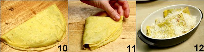 Falten Sie die Crêpes zur Hälfte 10 und dann in Viertel 11, legen Sie sie in eine Auflaufform 12. Bestreuen Sie sie mit dem restlichen Grana Padano und 40 g geschmolzener Butter, bevor Sie sie 10 Minuten bei 180°C im Grillmodus backen. Servieren Sie die Gorgonzola-Radicchio-Crepes heiß.