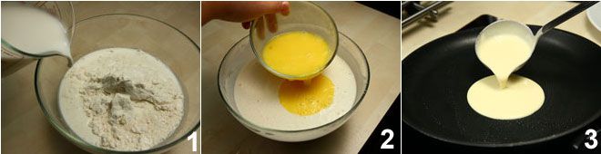 Um die Gorgonzola-Radicchio-Crepes zuzubereiten, beginnen Sie mit der Zubereitung der Crêpes, indem Sie das Mehl in eine Schüssel sieben, eine Prise Salz, die Milch 1 und die geschmolzene Butter hinzufügen und kräftig mit einem Schneebesen rühren, um Klumpenbildung zu vermeiden. Fügen Sie die beiden vorher verquirlten Eier 2 hinzu und lassen Sie den so erhaltenen Teig eine Stunde im Kühlschrank ruhen. Nach der Ruhezeit beginnen Sie, die Crêpes in einer Antihaftpfanne zu backen 3 (für das detaillierte Verfahren klicken Sie hier).