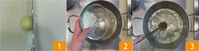 Um das Gorgonzola-Risotto zuzubereiten, bereiten Sie die Gemüsebrühe vor und halten Sie sie warm. Schälen und hacken Sie die Zwiebel 1. Dünsten Sie sie bei niedriger Hitze mit 25 g Butter in einem Topf an 2, bis sie weich ist 3, es dauert etwa 10 Minuten.