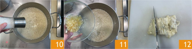 Salzen 10, fügen Sie die beiseite gestellte Zwiebel hinzu 11 und bringen Sie das Risotto zum Kochen, indem Sie bei Bedarf Gemüsebrühe hinzufügen. Schneiden Sie inzwischen den Gorgonzola in Stücke 12.