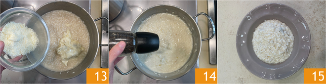 Am Ende der Garzeit schalten Sie die Hitze ab und fügen den Gorgonzola und den Parmigiano Reggiano DOP zum Mischen hinzu 13. Abschließend mit frisch gemahlenem Pfeffer, nach Belieben, würzen 14. Das Gorgonzola-Risotto ist servierfertig 15.