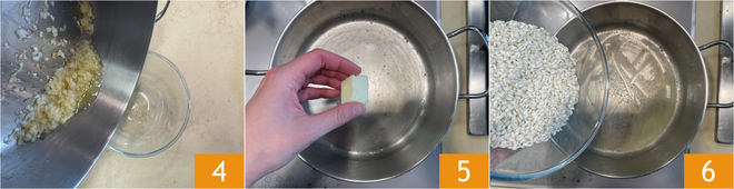 Stellen Sie die Zwiebel beiseite 4. Im selben Topf schmelzen Sie die weiteren 25 g Butter 5. Sobald sie geschmolzen ist, können Sie den Reis hinzugeben 6.