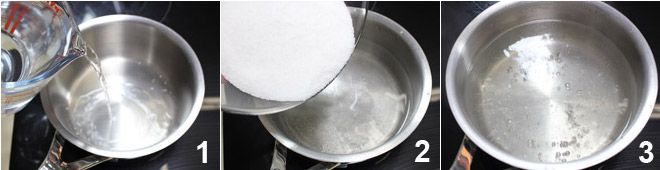 Um die Zitronengranita ohne Eismaschine zuzubereiten, geben Sie das Wasser in einen kleinen Topf 1, bringen Sie es zum Kochen und fügen Sie den Zucker hinzu 2. Wenn sich der Zucker vollständig aufgelöst hat und die Flüssigkeit klar geworden ist, schalten Sie die Hitze aus und lassen Sie den entstandenen Sirup abkühlen 3.