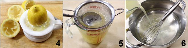 Schneiden Sie die Zitronen in zwei Hälften, pressen Sie sie mit einer Zitruspresse aus 4 und filtern Sie den Saft sehr gut mit einem Sieb 5: Sie sollten 500 ml gefilterten Saft erhalten. Fügen Sie ihn dem mittlerweile abgekühlten Sirup hinzu 6