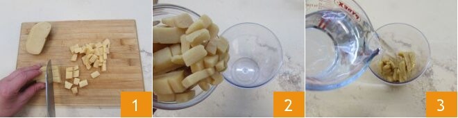 Um das Mandelgranita zuzubereiten, beginnen Sie damit, die Mandelpaste in kleine Würfel gleicher Größe zu schneiden 1. Geben Sie sie in ein hohes Gefäß 2 und fügen Sie das Wasser hinzu 3.