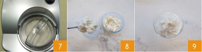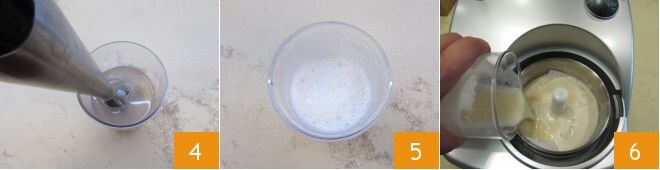 Pürieren Sie die Zutaten mit einem Stabmixer 4, bis Sie eine Creme erhalten 5. Gießen Sie die Mischung in die Eismaschine (befolgen Sie die Anweisungen Ihrer Eismaschine: bei der von uns verwendeten ist keine Kühlung des Behälters im Kühlschrank erforderlich) 6.