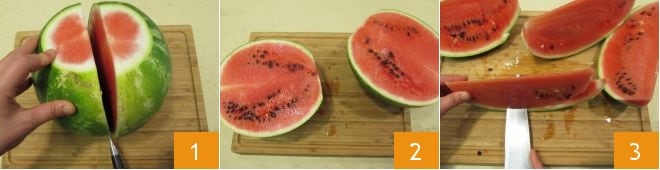 Um die Granita aus Wassermelone, Walderdbeeren und Wodka zuzubereiten, nehmt ihr zuerst die Wassermelone: Schneidet sie mit einem Messer ein 1, bis ihr sie in zwei Hälften geteilt habt 2, dann schneidet ihr sie in Scheiben 3 und schließlich in kleine Stücke.