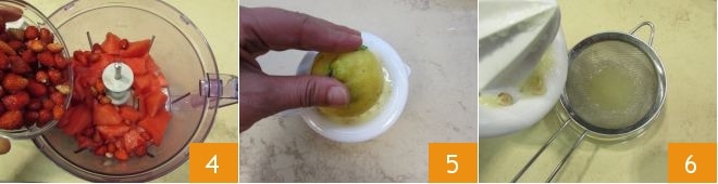 Gebt die in Stücke geschnittene Wassermelone und die Walderdbeeren in einen Mixer 4, dann presst die Zitrone aus 5 und filtert den Saft durch ein Sieb 6.