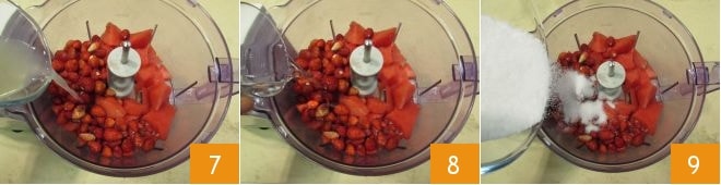 Gebt den Zitronensaft zusammen mit der Wassermelone und dem Zitronensaft 7 hinzu, dann fügt den Wodka 8, den Zucker 9 hinzu und mixt alles, bis ihr eine eher flüssige Konsistenz erhaltet.
