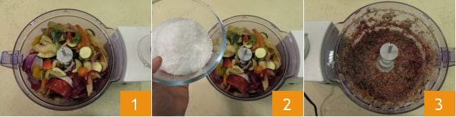 Um die Gemüsebrühe zuzubereiten, nehmt alle Reste eures Gemüses 1. Ihr könnt jede Art und jeden essbaren Teil jedes Gemüses verwenden. Ihr solltet insgesamt 760 Gramm Reste aus Schalen, Gemüsespitzen, Schnittresten usw. erhalten. Dann übertragt sie in den Behälter eines Mixers 1, fügt das grobe Salz hinzu 2 und mixt alles zu einem Püree 3.