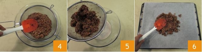 Setzt dann ein Sieb auf eine Schüssel und gebt die Mischung hinein und drückt mit einem Löffel 4, um überschüssiges Wasser zu entfernen 5. Legt dann ein Backpapier auf ein Backblech und gebt die Gemüsemasse darauf 6.