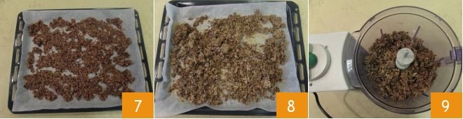 Verteilen Sie es gleichmäßig auf dem Blech 10 und backen Sie es im vorgeheizten, statischen Ofen bei 120°C für etwa 2,5 Stunden. Wenn das Gemüse gut getrocknet ist, nehmen Sie es aus dem Ofen 11, lassen Sie es abkühlen und geben Sie es wieder in den sauberen Mixer 12.